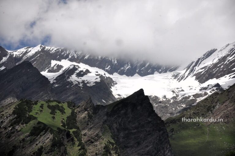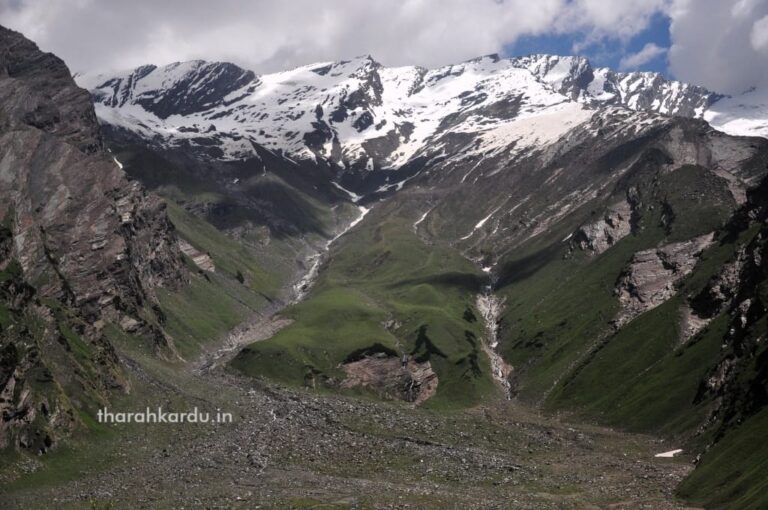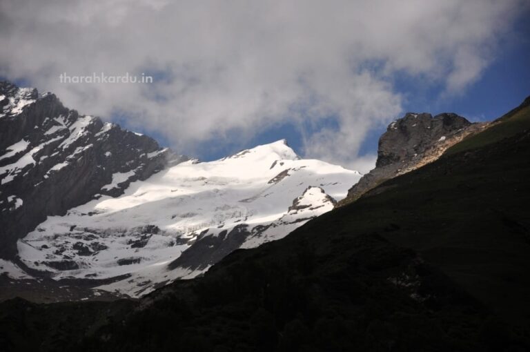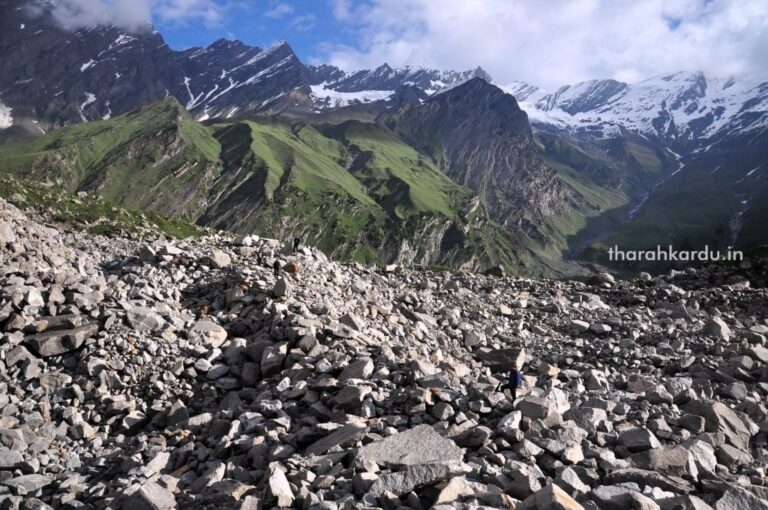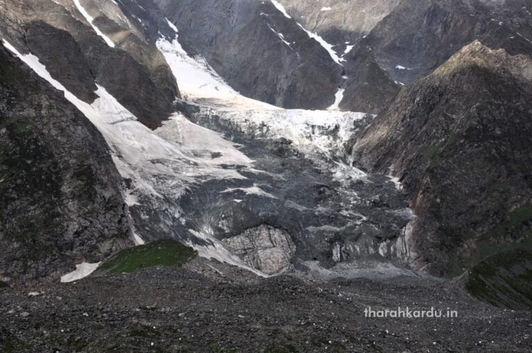The lake is fed by an interconnected system of glaciers and icefields positioned on the Pir Panjal side, locally described as the “Beas kundé rī dhar”. This section lies between Mt. Sheti Dhar (5,243 m / 17,200 ft) and Friendship Peak (5,288 m / 17,353 ft).